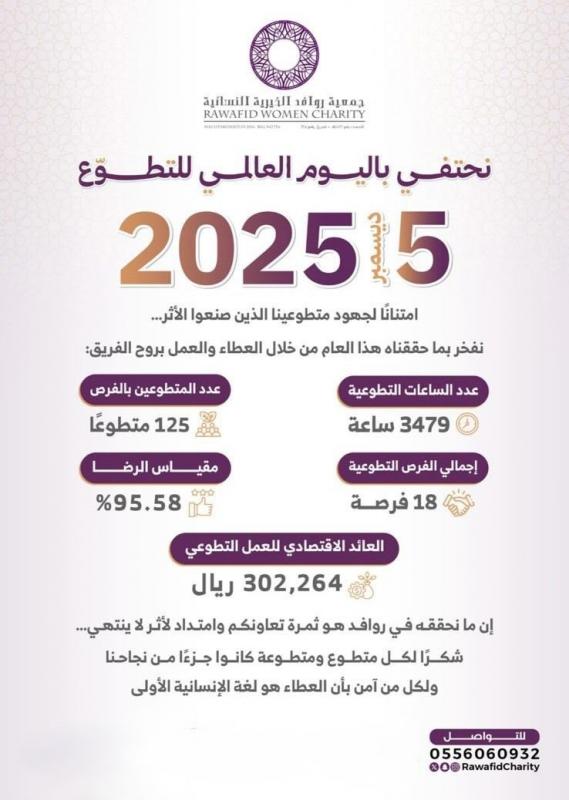 تحتفي في جمعية روافد الخيرية النسائية بالعيص في اليوم العالمي لتطوع 2025 فخورين بجهود متطوعينا الذين صنعوا الأثر بعطائهم وإخلاصهم. شكرًا لكل قلب معطـاء كان جزءًا من نجاحنا هذا العام.