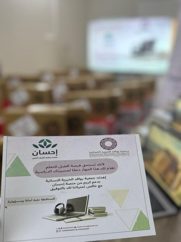 بدعمٍ سخيّ وكريم من المنصة الوطنية للعمل الخيري (إحسان)، نفّذت جمعية روافد الخيرية النسائية بمحافظة العيص مشروع الأجهزة التعليمية، بقيمة إجمالية بلغت 104,000 ريال، وذلك في إطار جهودها المتواصلة لدعم العملية التعليمية وتمكين الطلاب والطالبات من مواصلة تعليمهم. وشمل المشروع توفير أجهزة لابتوب عالية الجودة وطابعة ذات مواصفات متقدمة، بما يسهم في تهيئة بيئة تعليمية مناسبة تعتمد على التقنيات الحديثة، وتعزز من فرص التحصيل العلمي والنجاح الأكاديمي. وقد بلغ إجمالي عدد المستفيدين من المشروع 363 مستفيدًا من الطلاب والطالبات المسجلين لدى الجمعية، تأكيدًا على حرصها في الاستثمار في التعليم بوصفه ركيزة أساسية لبناء مستقبل واعد.